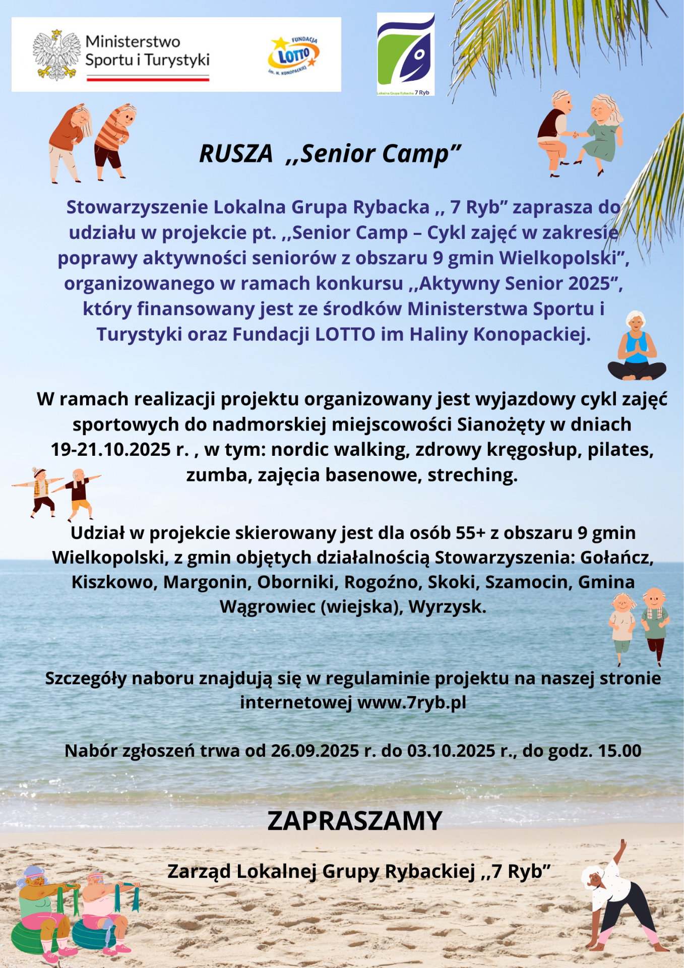 Stowarzyszenie Lokalna Grupa Rybacka ,, 7 Ryb’’ zaprasza do wzięcia udziału w projekcie pt. ,, Senior Camp – Cykl zajęć w zakresie poprawy aktywności seniorów z obszaru 9 gmin Wielkopolski’’, organizowanego w ramach konkursu ,, Aktywny Senior 2025‘’, który finansowany jest ze środków Ministerstwa Sportu i Turystyki oraz Fundacji LOTTO im Haliny Konopackiej.